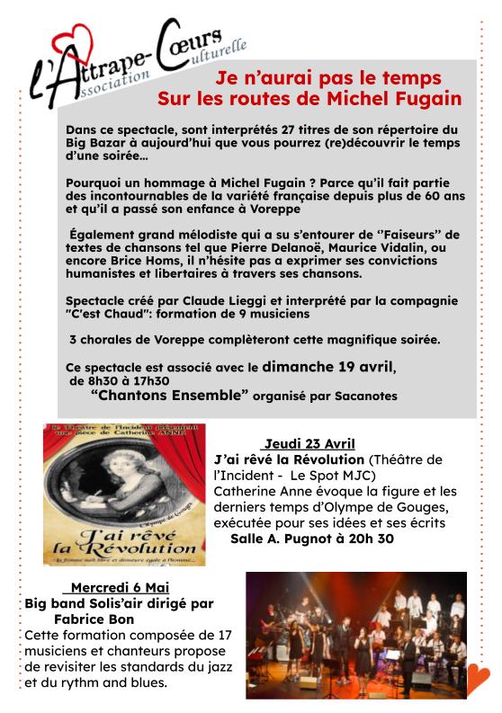 Dans ce spectacle musical, créé par Claude Lieggi et interprété par la compagnie "C'est Chaud", en hommage à Michel Fugain, sont interprétés 27 titres de son répertoire du Big Bazar à aujourd’hui que vous pourrez (re)découvrir le temps d’une soirée..