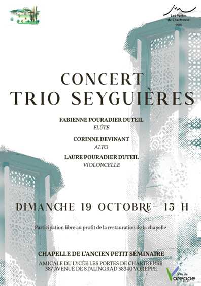 Dans le cadre de l'exposition "De béton et de lumière" qui aura comme temps fort un hommage à Pierre Pouradier Duteil, architecte qui a conçu et réalisé le Petit Séminaire de Voreppe, nous accueillons le trio Seyguières.