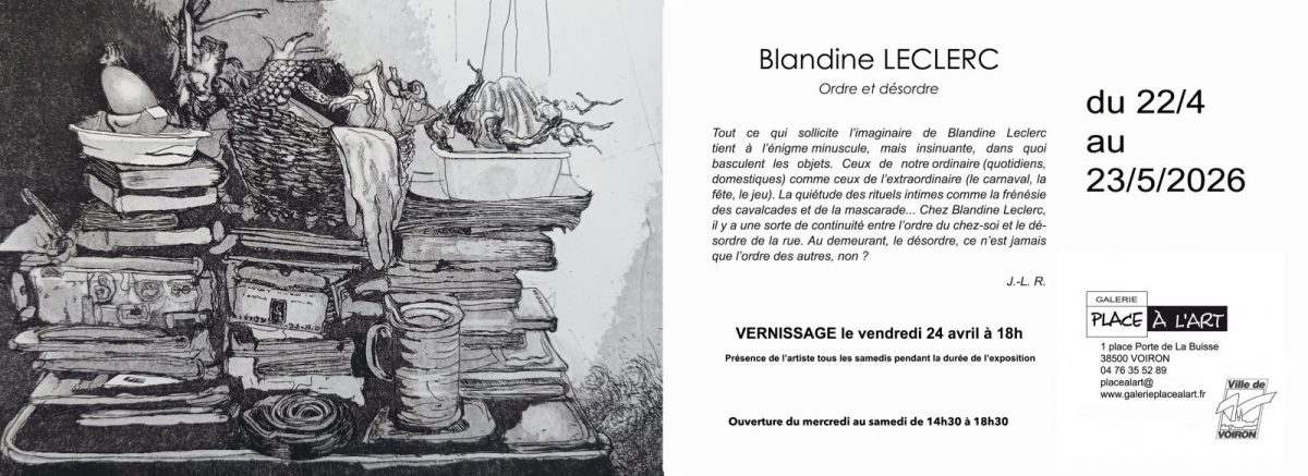Tout ce qui sollicite l'imaginaire de l'artiste Blandine Leclerc tient à l'énigme minuscule, mais insinuante, dans quoi basculent les objets Ceux de notre ordinaire (quotidiens, domestiques) comme ceux de l'extraordinaire (le carnaval, la fête, le jeu)...