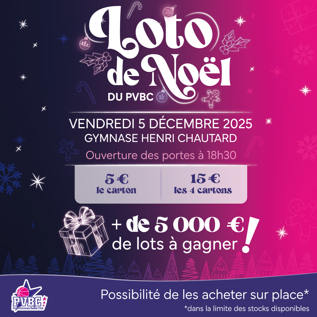 Venez nombreux à la soirée loto du Pays Voironnais Basket Club. 100 % ambiance Noël : musique, restauration, convivialité… et + de 5 000 € de lots à gagner !