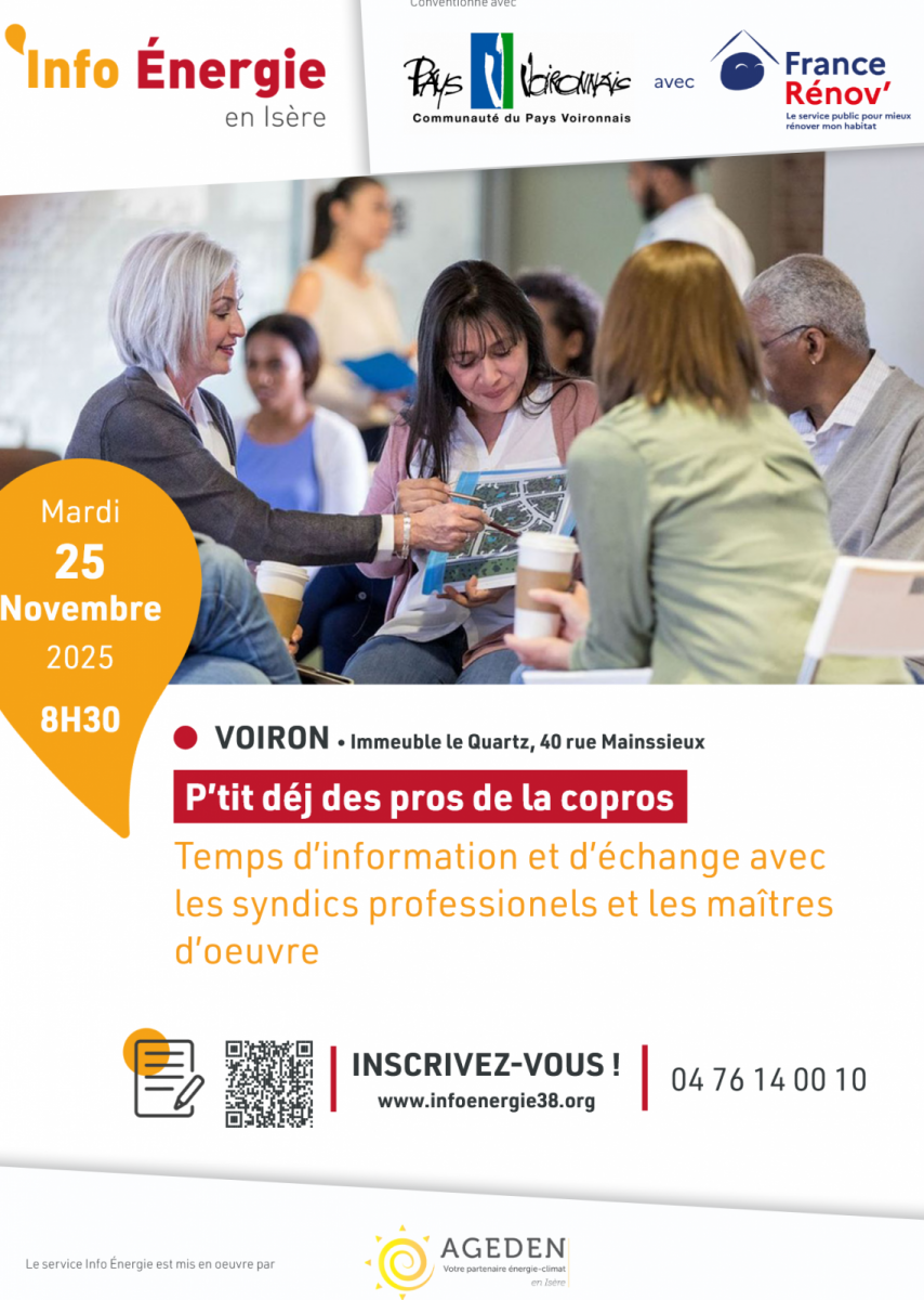 Accès : Gratuit. Inscription obligatoire. Réservé aux syndics habitant·es ou possédant un bien dans la communauté d’agglomération du Pays Voironnais, ainsi qu’aux acteurs impliqués dans la gestion de copropriétés sur ce territoire (syndics de copropriétés, conseils syndicaux de copropriétés, etc.).
